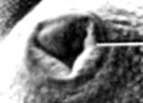 Хорошо видны контуры дна формирующейся брюшной присоски с передней и боковых сторон. Присоска начинает принимать пирамидальную форму. Контуры брюшной присоски трехдневной фасциолы четко очерчены. Они хорошо выделяются своей определенной формой в центре брюшной поверхности тела по ее средней линии (рис. 4).